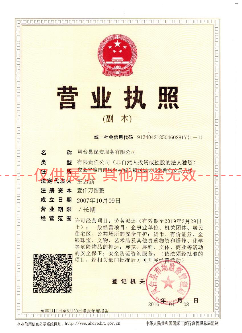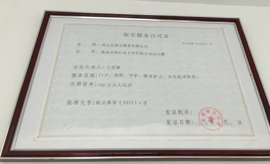 鳳臺(tái)保安服務(wù)有限公司成立于2007年,是經(jīng)鳳臺(tái)縣公安局行政許可的經(jīng)營企業(yè),注冊資金1000萬元,具有國企背景(安徽州來控股有限公司),更是一家朝氣蓬勃的年輕企業(yè)。公司主營勞務(wù)派遣、保安服務(wù)、武裝押運(yùn)等。 >>了解更多